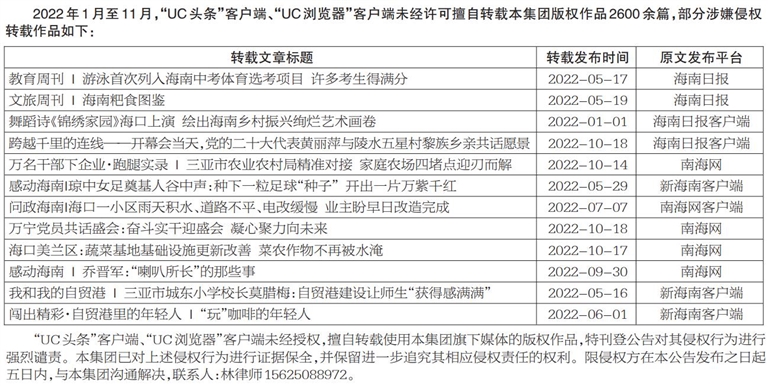 近期,不少网站、客户端违反《中华人民共和国著作权法》《信息网络传播权保护条例》等法律法规,未经书面许可,擅自转载本集团旗下媒体海南日报、海南日报客户端、南海网、新海南客户端、南海网客户端、南国都市报等版权作品,涉嫌侵犯相关著作权人的合法权益。为规范网络转载行为,制止非法侵权转载,本集团郑重公告: