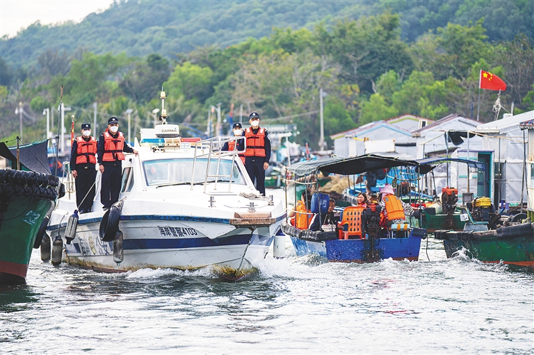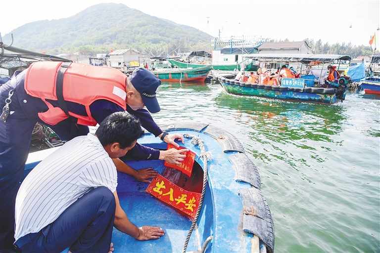 上图:1月21日,除夕,在陵水黎族自治县新村镇新村港,海上警务室的民警进行日常巡逻,守护渔民安全。下图:1月21日,海上警务室民警为渔民送上新春祝福。本报记者 袁琛 摄
