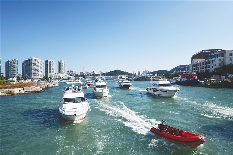 1月19日,三亚湾畔,游客乘坐游艇感受乘风破浪的惬意。