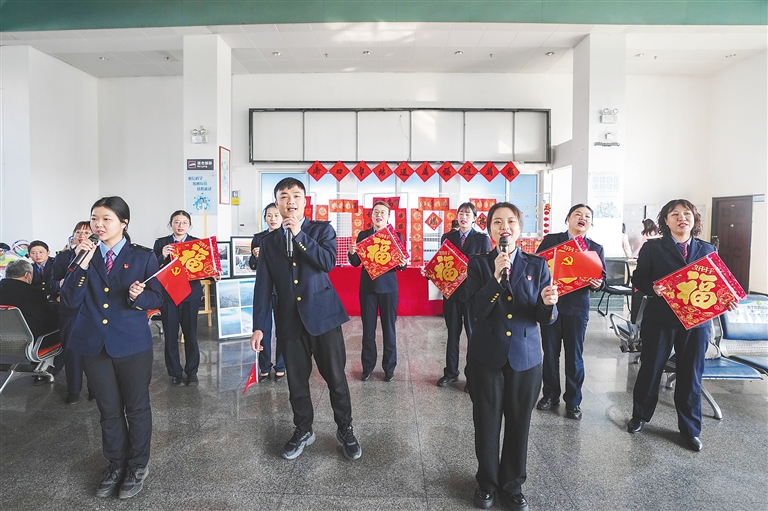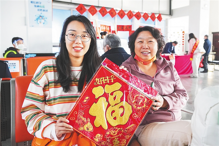 1月20日,海口火车站市郊候车室内,车站工作人员举办了一场“送万福进万家”与旅客互动联欢活动,现场有诗词朗诵、吉他弹奏、歌曲合唱等演出,还有写春联、送“福”字,为旅客送上美好的新春祝福,吸引了不少正在候车的旅客驻足观看并参与趣味问答互动活动。本组图片均由本报记者 武威 摄
