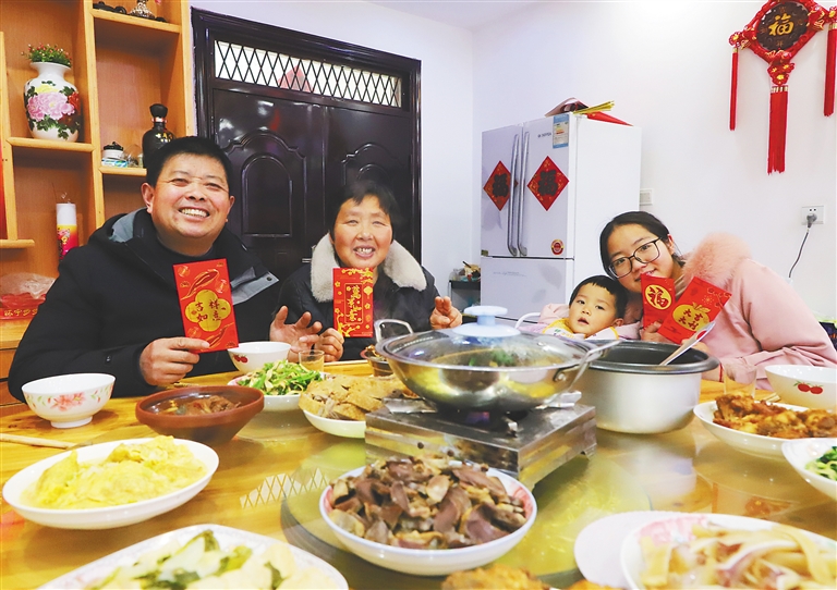 在安徽省肥西县官亭镇一户居民家里,祖孙三代人在年夜饭饭桌上合影留念。