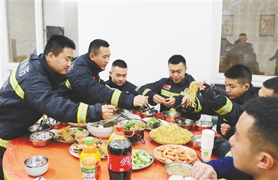 在福建省龙岩市消防救援支队,消防队员在吃年夜饭。