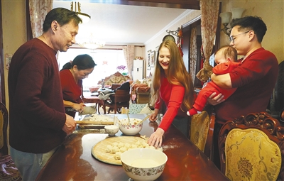 来自德国的张珍妮(左三)与丈夫张鼎然(右一)在北京的家中和家人一起包饺子。