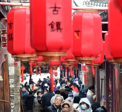 1月24日,游客在安徽省肥西县三河古镇景区游玩。