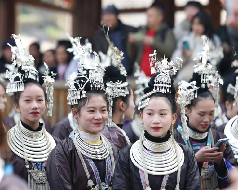 1月25日,贵州省从江县西山镇顶洞村的侗族姑娘身着盛装参加活动。