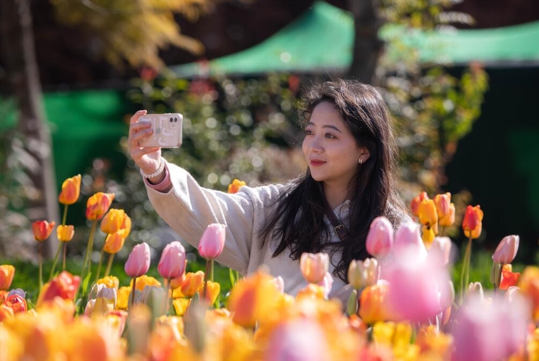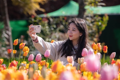 1月25日,游人在昆明捞渔河湿地公园郁金香花展上自拍。