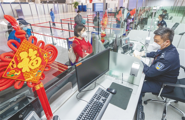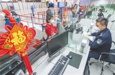 1月26日,在海口美兰国际机场,出入境边防检查站民警为出境旅客办理业务。本报记者 袁琛 摄