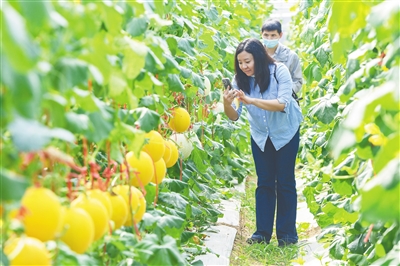 在三亚崖州南繁育种基地西甜瓜专业化田间品种展示平台,育种科研人员在拍照。资料图