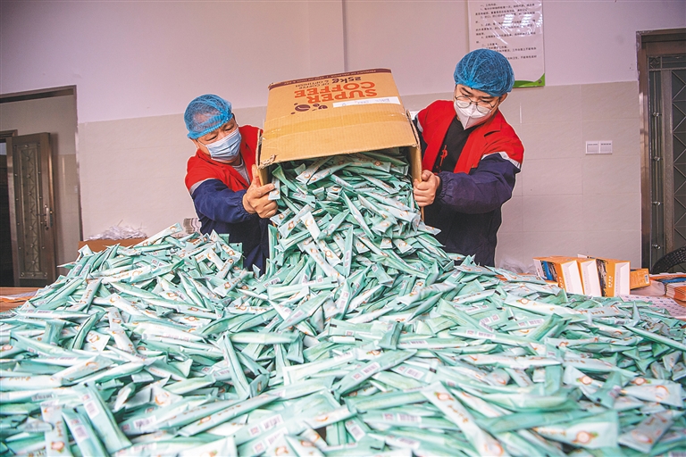 在工厂门口,一辆货车才装完车,正准备将刚生产的2万多盒咖啡运往三亚的景区。车间里,周忠海和同事们又在为刚接到的新订单忙碌着。