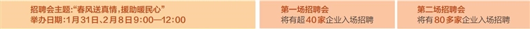 据了解,两场招聘会以“春风送真情,援助暖民心”为主题,将分别于1月31日、2月8日9:00—12:00在海口市人力资源市场一楼(海口市嘉华路2号)举办。第一场招聘会将有超40家企业入场招聘,第二场将有80多家企业入场招聘,涵盖科技、餐饮、传媒、金融、医药等行业,提供平面设计师、会计、医药代表、运维工程师等多类型岗位。