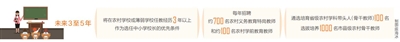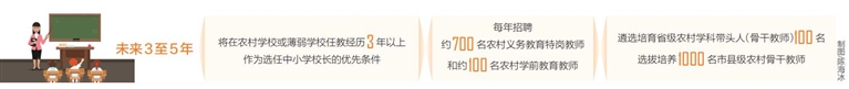 《方案》明确,实施农村教师“千百十引进工程”,每年吸引千名紧缺学科新教师、百名优秀教育人才、数十名优秀校长到农村学校任职任教。每年招聘约700名农村义务教育特岗教师和约100名农村学前教育教师。面向社会公开招募已退休的优秀校长、教师、教研员到乡村学校讲学。面向优秀退役运动员、退役军人和艺术工作者补充音乐、体育、美术、劳动教育等师资。
