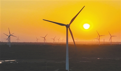 1月30日,在儋州市峨蔓镇,一座座白色风车在夕阳下迎风转动,成为海边一道亮丽的风景线。