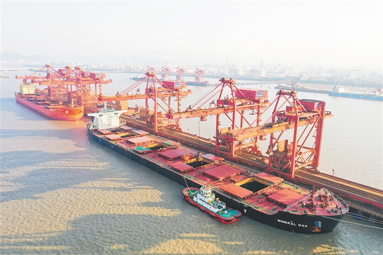 图为1月30日,在浙江省宁波舟山港北仑港区矿石码头,货轮在进行装卸作业。新华社发