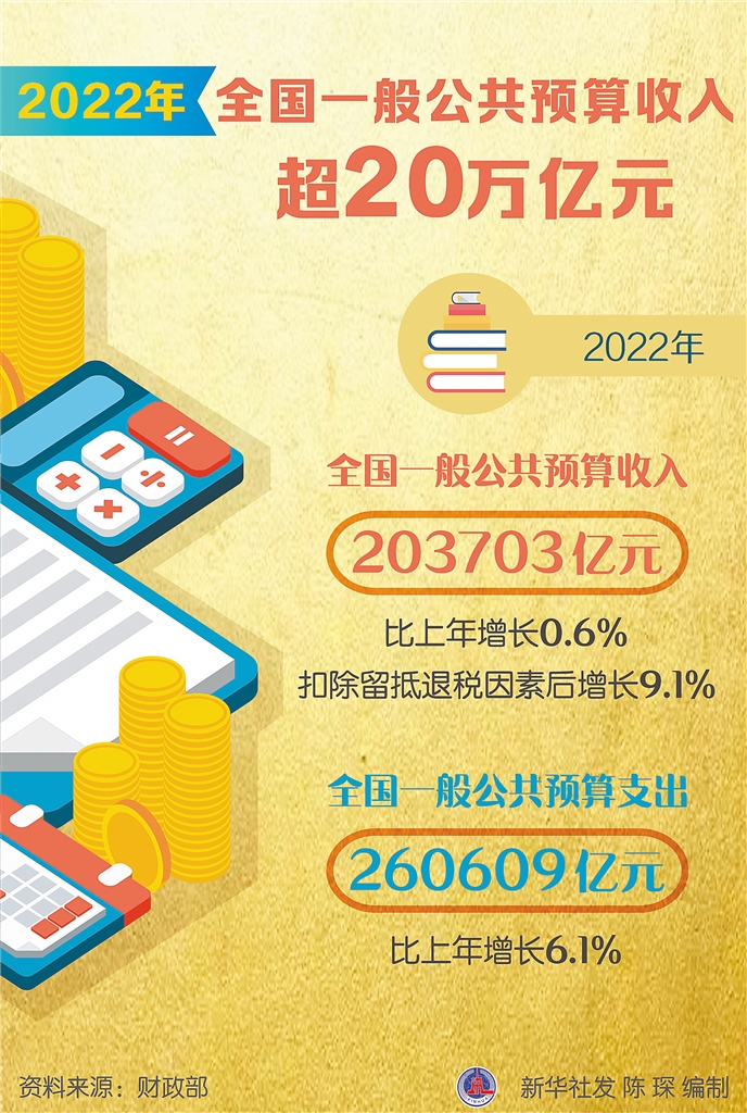 新华社北京1月30日电 (申铖 梁晓纯)财政部30日公布了2022年财政收支“成绩单”。数据显示,2022年,全国一般公共预算收入203703亿元,比上年增长0.6%,扣除留抵退税因素后增长9.1%;全国一般公共预算支出260609亿元,比上年增长6.1%。
