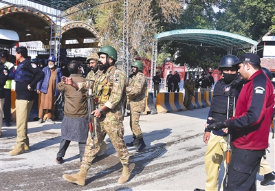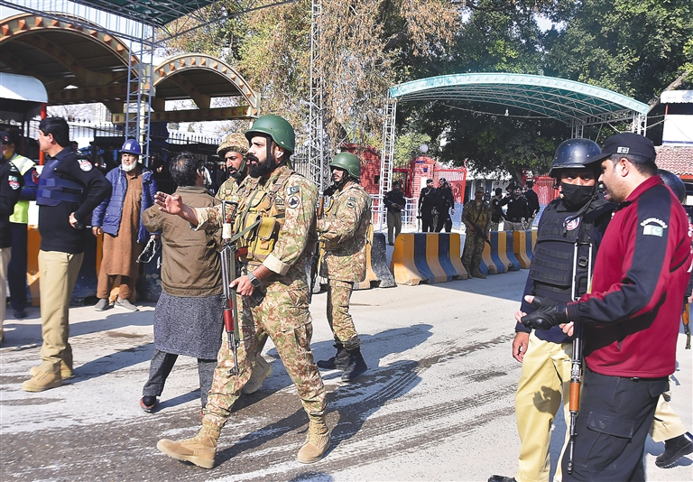 1月30日,在巴基斯坦西北部开伯尔-普什图省首府白沙瓦市,安全人员在爆炸袭击事件现场附近警戒。