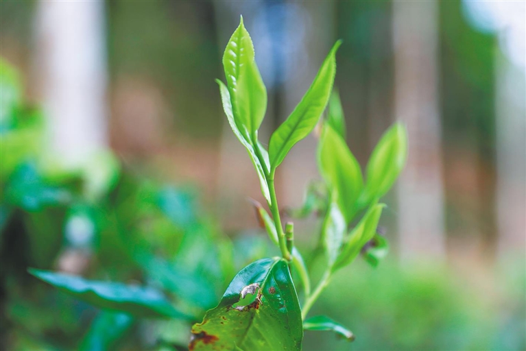 山谷间传来清澈的流水声,林中鸟鸣不断。记者走进水满乡方响村的一个茶园,只见一垄垄灌木状的茶树分布于陡坡之上,其间还有几株三四米高的大茶树。“这里的茶树都是海南大叶种,那几株高的,听村民说是从深山里移栽的。”五指山印象水满茶叶专业合作社负责人董国豪介绍,与其他茶园不同的是,这个茶园的大小茶树栽种在其他树种之间,采用了“林茶共生”的种植模式,茶树的生存状况更接近野生。