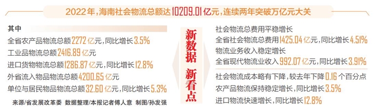 2022年,海南社会物流总额达10209.01亿元,连续两年突破万亿元大关