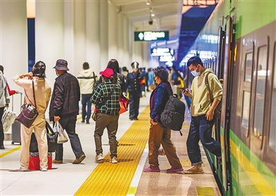 图为旅客乘坐动车组列车抵达云南勐腊站。