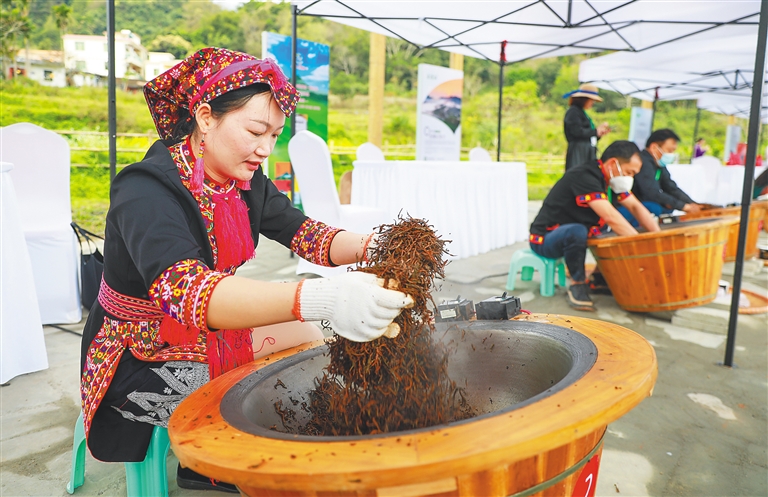 2月4日,以“华夏春早 雨林茶香”为主题的2023年海南(五指山)早春茶开采节在五指山市水满乡举办。水满乡是海南省茶叶主产区之一,近年来当地将民族文化融入茶产业发展,初步实现三产深度融合发展。图为手工制茶技艺展示。本报记者 李天平 摄