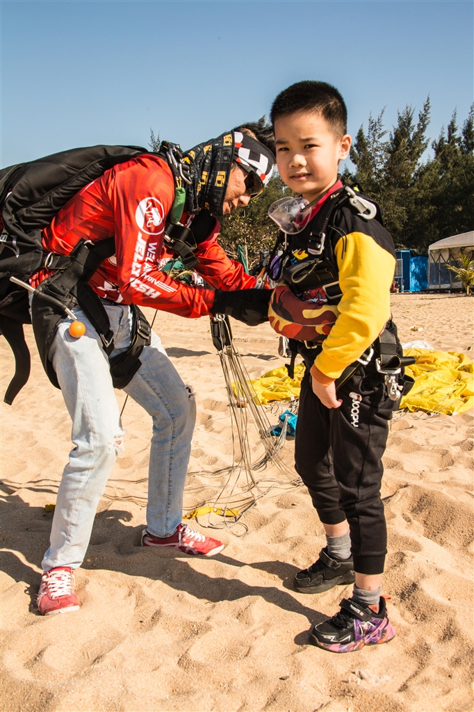 2月1日下午,跳伞教练刘金东陪护一名儿童,在4000米的高度跳伞,约3分钟后精准、安全降落在海花岛附近的沙滩上。儋州海花岛阳光明媚、万里晴空,吸引了全国各地的游客慕名而来。