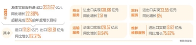 据统计,2022年海南实现服务进出口353.62亿元,同比增长22.88%,超额完成15%的年度增长目标。其中,进口171.81亿元;出口181.81亿元,同比增长112.21%,服务出口增幅大于进口127.2个百分点,带动服务贸易实现顺差10亿元。