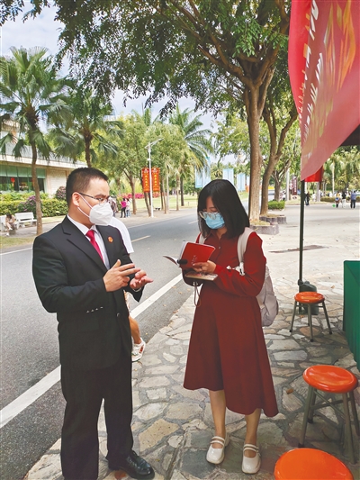 大年初二,我来到三亚南山文化旅游区,跟着三亚城郊人民法院崖城人民法庭庭长钟海坚,在旅游巡回法庭值了一天的班。期间,他为游客解答法律疑惑、向游客分发法律宣传单、主动询问游客旅途是否顺利。在他看来,旅游巡回法庭就是游客的定心丸,化解了游客的矛盾纠纷,就兜住了海南旅游口碑的底线,“即便没有发生纠纷,大家看到我们也会感到安心、踏实”。