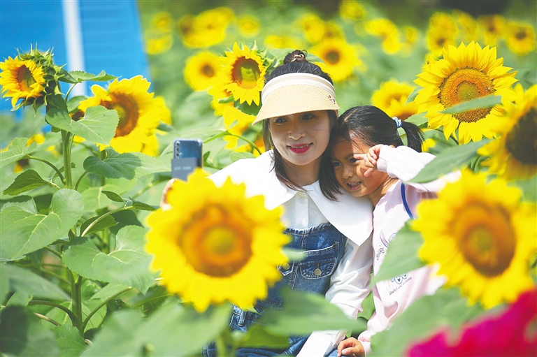 近日,三亚南山文化旅游区里的种植的三角梅、向日葵、格桑花等陆续绽放,春意渐浓,阳光明媚,引来不少游客赏春游玩。图为家长带着孩子在三亚南山文化旅游区花海中游玩。