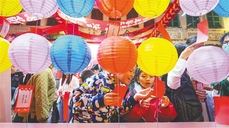 猜灯谜是元宵节最受欢迎的传统项目。缀满灯谜的长廊下人头攒动,兑奖处热闹非凡,投壶纳吉、百发百中、身手不凡等趣味游园区域欢声笑语不断,汉服体验、国潮集市也吸引了众多游人驻足,处处洋溢着浓郁的喜庆氛围,一派火热的闹元宵盛景。