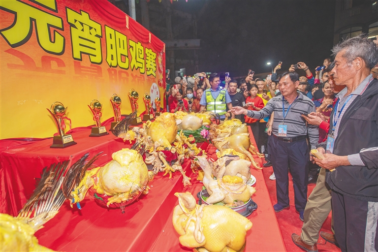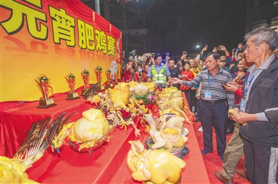 农历正月十五,是琼海博鳌镇乐城村一年中最热闹的日子,赛肥鸡是当地的重头戏,也是极富有特色的民俗活动。这一天,乐城村民们将家中最肥美的鸡宰杀好,送至村中“打擂台”,再由乡贤组成的评委会评选出夺魁肥鸡。谁家的鸡最肥,说明谁家最会养鸡,这也是当地人心中勤劳的象征。