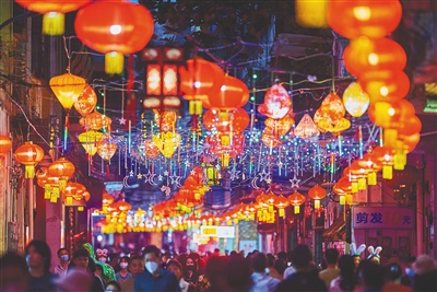 夜幕降临,府城地区大街小巷灯火辉煌,人山人海,一派热闹的节日景象,市民游客手拿着鲜花,一边欣赏花灯,一边换花祈福。