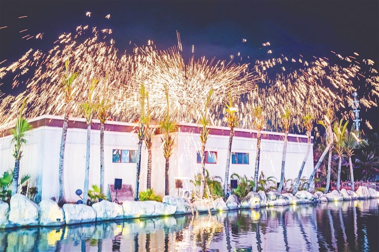 “从除夕夜到元宵节,园区每晚都举行‘打铁花’表演,此外还有100余场开放式主题演出、海鲜狂欢美食节、游玩项目折扣优惠等一系列活动,以丰富的旅游产品,拓展旅游消费空间,让‘客流’变‘客留’。”三亚海昌梦幻海洋不夜城品牌推广经理王媛媛说。