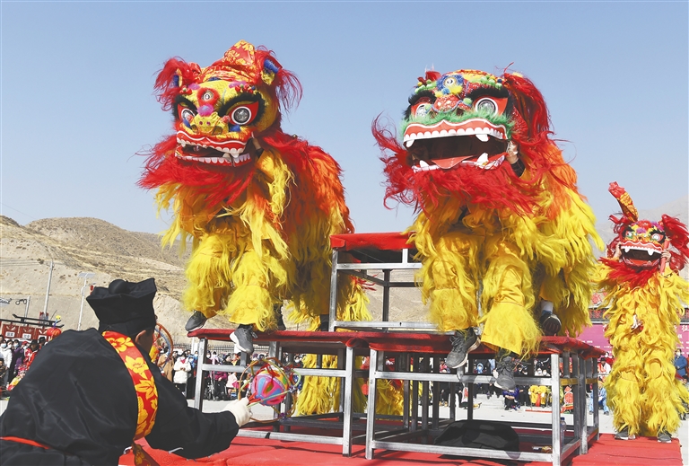 在甘肃省永靖县刘家峡镇城北新村,民间艺人在表演舞狮。
