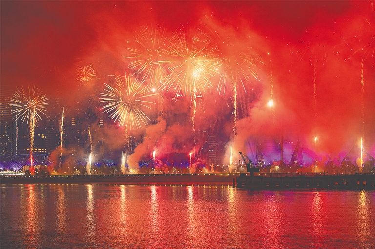 在钱塘江畔拍摄的杭州“迎亚运、庆元宵”烟花灯光秀表演。 (本版照片均由新华社发)