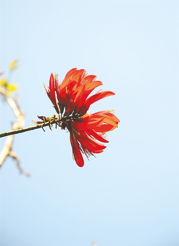 海南一年四季均有花可赏,但数春花种类最多、最有代表性。数百年前,古代的文人墨客就已注意到了海南春日里的花韵。苏轼在诗中写道:“记取城南上巳日,木棉花落刺桐开。”明代海南著名诗人王佐诗云:“刺桐花开三月天,鹧鸪声里好闲眠。”明代海南巨儒丘濬写道:“寒食清明都已过,枝上榴花红朵朵。” 古时上巳日就是三月初三,那时木棉花刚落,刺桐花赶趟儿似的,接着绽放。无论是木棉花还是刺桐花,它们都以红艳艳的身姿,装扮了海南春天的景致。