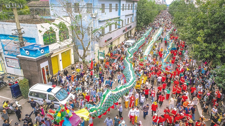 2月6日,农历正月十六,儋州市白马井镇举行传统“拜年日”巡游活动。每逢正月十六举行的“拜年日”是当地特有的习俗,由当地村民组成的舞龙、儋州调声、“迎神”等巡游队伍穿过白马井主要街道,吸引众多民众观看。本报特约记者 吴文生 摄