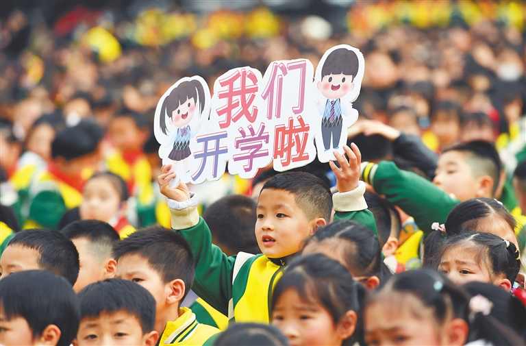 2月6日,全国多地迎来2023年春季学期开学。图为四川省南充市蓬安县实验小学的学生举着“我们开学啦”的牌子参加开学典礼。新华社发
