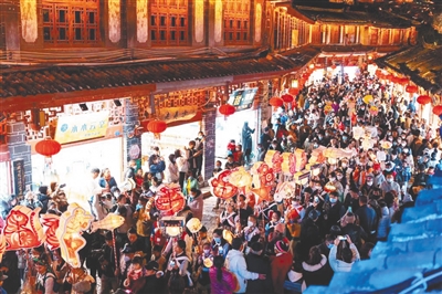 连日来,随着旅游市场强劲复苏,世界文化遗产丽江古城时常上演这样的热闹场景。丽江古城保护管理局常务副局长木丽介绍,春节黄金周后,游客接待量继续保持高位运行。