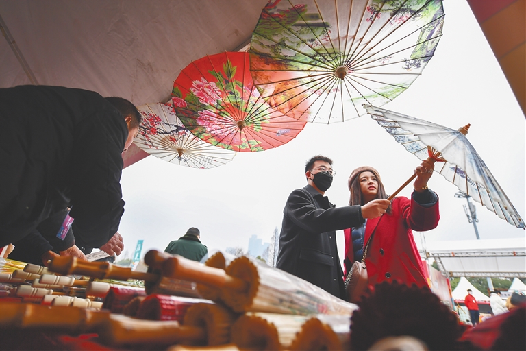 市民和游客在湖南非遗元宵喜乐会现场参观非遗项目“浏阳油纸伞制作工艺”。新华社发