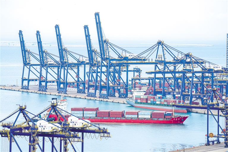 2月8日,海口港集装箱码头,货轮穿梭,一片繁忙景象。目前,我省正加快建设西部陆海新通道国际航运枢纽和国际航空枢纽,构建海南自由贸易港现代物流服务体系。