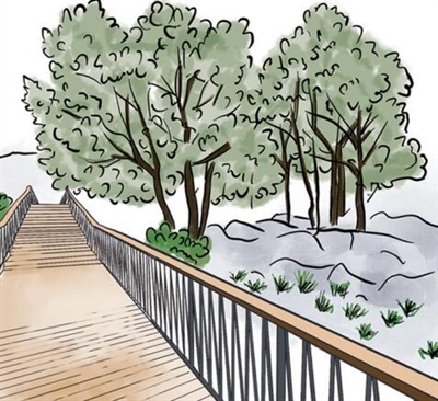 木栈道与环岛慢行系统相连,全长5公里,建成后将成为碳汇展示路线。环岛步行慢道沿途还设有电力座椅,可实现自主供给电力,为游客提供无线网络以及无线充电。
