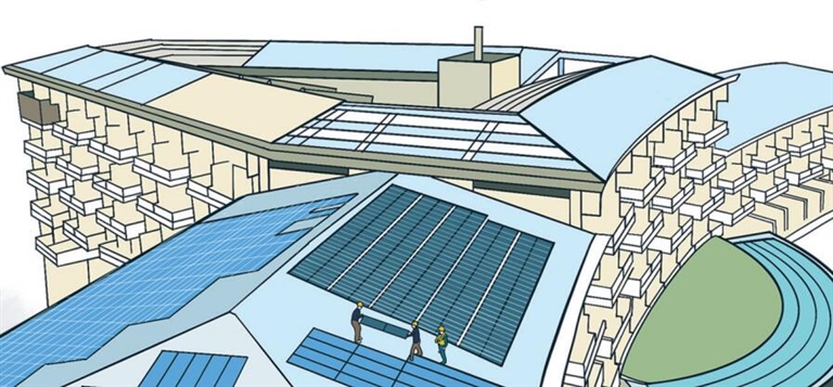 为了确保建筑美观,装在屋顶的光伏板在设计上也综合考虑了建筑本身的外观与结构,契合屋顶坡度。此外,为充分利用建筑空间,项目团队在不影响建筑透光的情况下,还设计了玻璃幕墙发电、遮阳板发电、栏杆发电、连廊顶棚玻璃发电等。