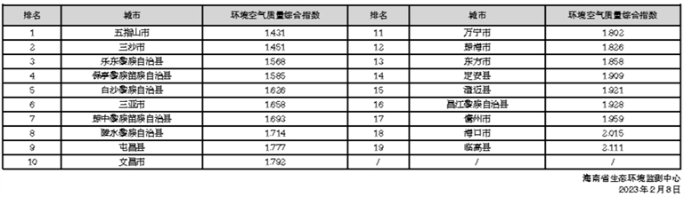 环境空气质量排名靠前的市县分别是五指山市、三沙市和乐东黎族自治县,排名靠后的分别是儋州市、海口市和临高县。2022年全省19个市县环境空气质量排名如右:
