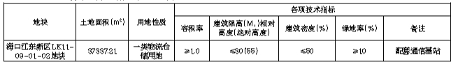 一、地块的基本情况和规划指标要求:(一)基本情况和宗地净地情况。本次挂牌出让的宗地位于海口市江东新区LK11-09-01-02地块,面积为37337.21平方米(56亩),土地用途为一类物流仓储用地,出让年限为50年。目前地块安置补偿落实到位、地上附着物已清表、土地权利清晰、无法律经济纠纷、土地开发利用规划条件明确、土壤无污染,具备动工开发必需的条件。(二)主要规划指标。海口市江东新区LK11-09-01-02地块用地的规划指标情况详见下表: