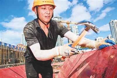 2月9日,三亚紫金国际中心写字楼项目现场,工人进行木材立模施工。本报记者 封烁 摄