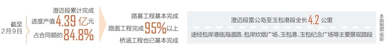 海南省环岛旅游公路项目第六工区位于环岛旅游公路西段的临高和澄迈境内,主线总里程105公里,包括新建、改建和利用原有路段。截至2月9日,澄迈段累计完成进度产值4.39亿元,占合同额的84.8%,路基工程基本完成,路面工程完成95%以上,桥涵工程也已基本完成。