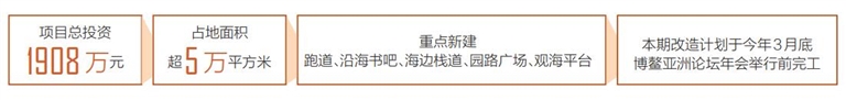 据了解,本次开工的博鳌镇滨海风情街旅游基础设施配套工程项目占地面积超5万平方米,不仅将对妈祖庙前广场、妈祖庙侧亭子等设施进行修复,还将重点新建跑道、沿海书吧、海边栈道、园路广场、观海平台,搭建救援塔、旅游设施,并做好周边排水、绿化、挡墙护坡建设工作。
