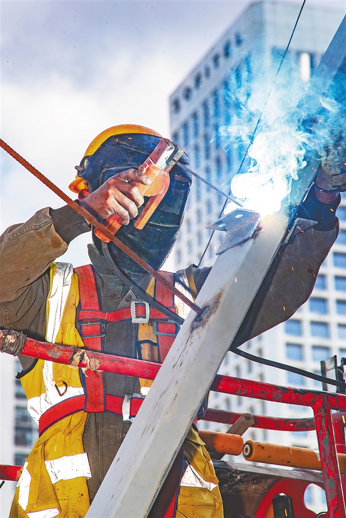 二月十日,海口演艺新空间(二期)工程建设现场,工人进行钢柱电焊施工。本报记者 封烁 摄