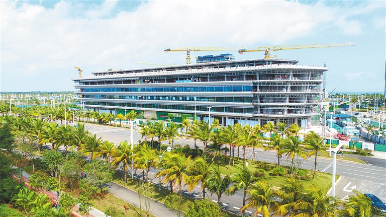 近日,在海口江东新区总部经济区,江东发展大厦加快建设。本报记者 袁琛 摄