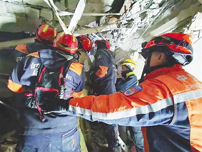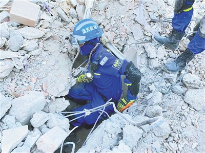 中土两国救援队在倒塌楼房废墟中实施救援。