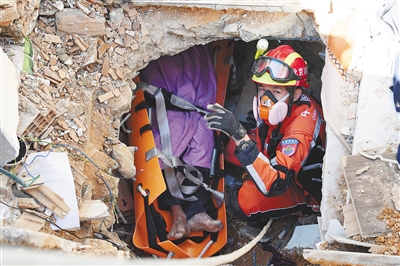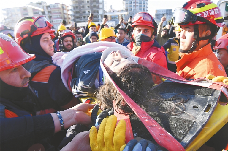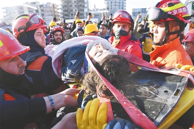 中国救援队与土耳其救援队转移一名救出的女性幸存者。